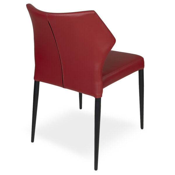 The Bell Dining Chair features a uniquely modern silhouette with a curved hexagonal backrest and slim tapered legs. Bell is upholstered in red top-grain Italian leather for a luxurious feel, with black legs made of powder-coated metal. A thoughtfully designed shape lets Bell be stacked with others of its kind, resulting in a chair that’s both space-savvy and boldly elegant.