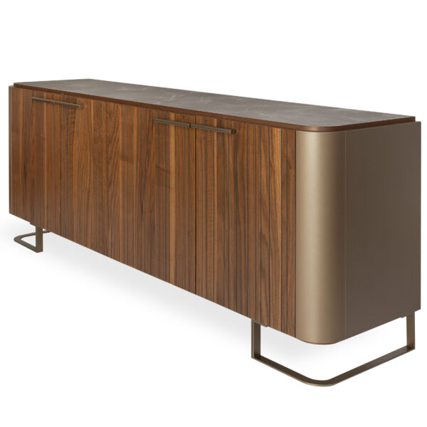 With its masterful blend of materials and textures, the Chiesa Buffet embodies the pinnacle of contemporary luxury, with nods to mid-century modern design. Chiesa’s cabinet fronts immediately catch the eye with their walnut veneer carved in irregular vertical channels. Gold lacquer adorns the curved sides of the buffet, and the top is finished in grey eco-stone with white veining for an opulent look. Four cabinets with interior shelving keep your dining collection organized, and a cutlery drawer offers a helpful place to store silverware. Metal legs with a unique rounded shape add the finishing touch to this sumptuous, Italian-made buffet.